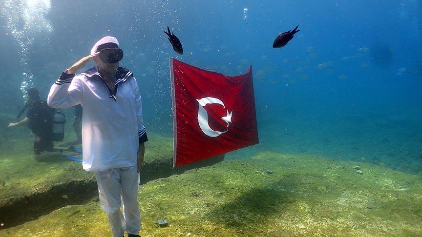 Muğla'nın Fethiye ilçesinde bir dalış okulunun dalgıçları, 30 Ağustos Zafer Bayramı nedeniyle su altında Türk bayrağı açtı ve saygı duruşunda bulundu.