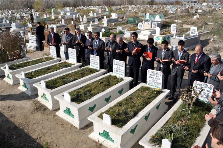 Depremde kendisi ile eşi ve çocuğu da yaşamını yitiren öğretmen Mehmet Murat İşler'in mezarı başında Kur'an-ı Kerim okuyan İmam Hatip Lisesi öğrencileri, 64 öğretmen için dua etti.