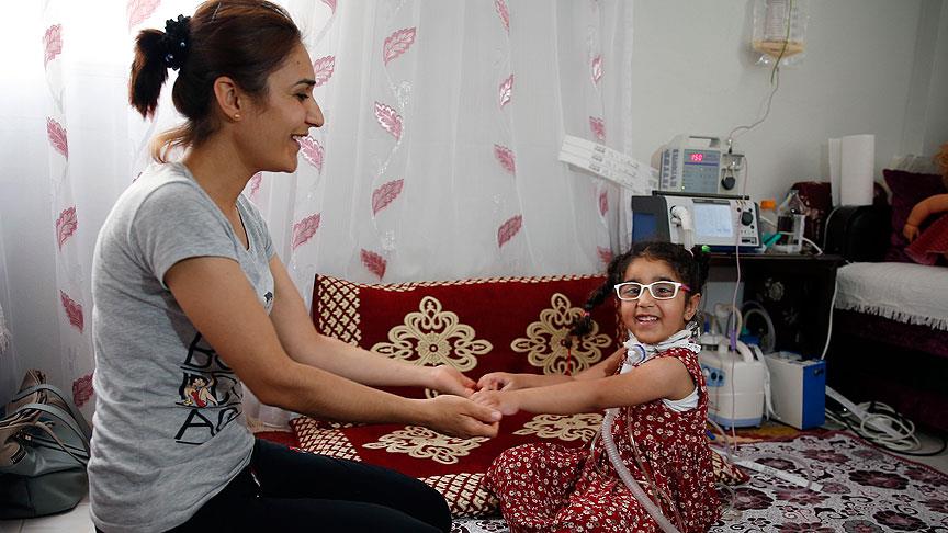 "Karnından mama ile besleniyor. Üç kez kalbi durdu, kalp masajıyla hayata döndü. Zaman zaman ataklar geçiriyor. Ara ara nefes alamıyor, kalp atışları düşüyor, morarıyor. Çok çabuk yoruluyor. Konuşmaktan, oynamaktan, ayakta durmaktan yoruluyor. Diğer çocuklar gibi sokakta koşup oynayamıyor. Sadece evin içinde, düz zeminde oynuyoruz. Yokuş, merdiven çıkamıyor."