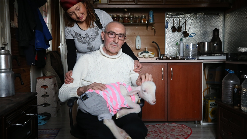 Sakarya'da annesi doğum sırasında ölen kuzu, kendisini sahiplenen ailenin evinde sıcak yuvaya kavuştu.