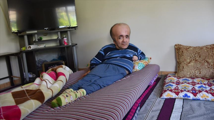 Hatay'ın İskenderun ilçesinde doğuştan hidrosefali hastalığı bulunan yüzde 92 engelli 42 yaşındaki Abdullah Akkoç, ailesi tarafından ilk günden bu yana özenle bakılıyor.