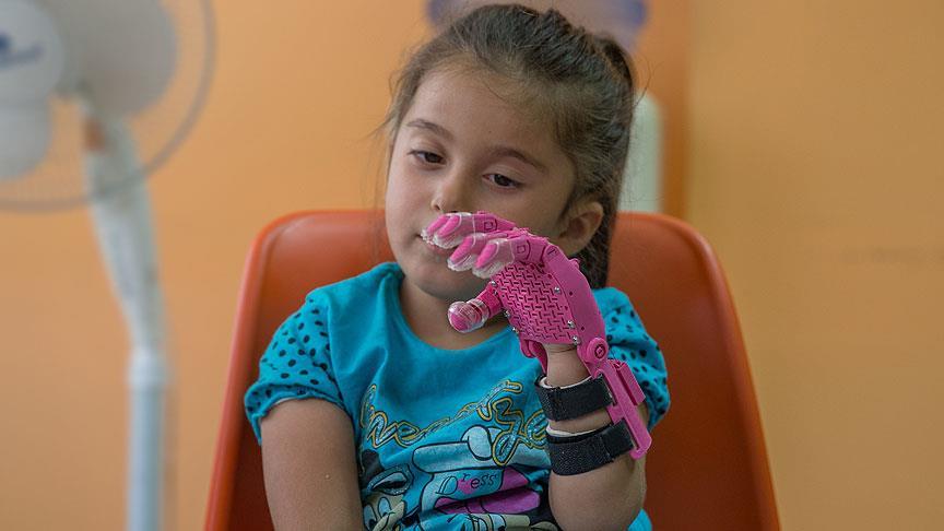 Küçük Evin'in isteği üzerine pembe renkli ve prenses motifli tasarlanan el, kızın bileğine monte edildi.