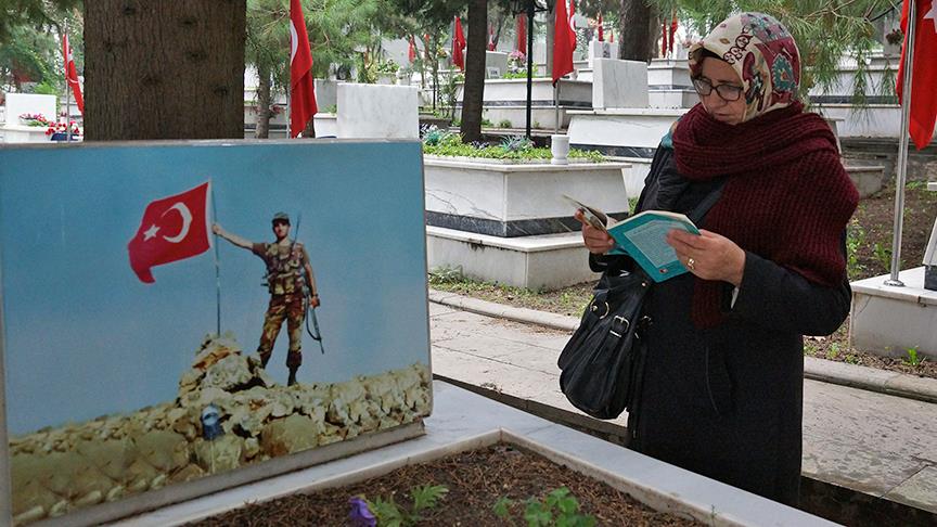 "Oğlum asker olmayı çok istiyordu. Şehitliğe her geldiğimde çok üzülüyorum ama buraya gelmeyi sabırsızlıkla bekliyorum. Burada oğlumun yanında teselli buluyorum. Evde de burada da onunla konuşuyorum. Zeytin Dalı Harekatı'nın başladığı gün çok mutlu oldum. Hemen o gün oğlumun kabrine koşup ona müjdeli haberi verdim. Evladıma da silah arkadaşlarının yazdığı kahramanlıkları anlattım. Şehit askerlerimizin analarına Allah sabır versin. Beni de çağırsınlar ben de gideyim, oğlumun intikamını almış olurum. Türkiye'nin bu terörden kurtulması lazım."