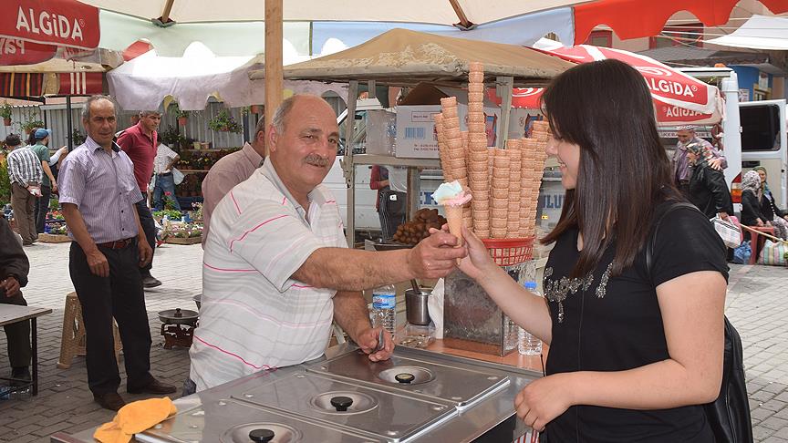 Satış için genelde pazar yerlerini tercih ettiğini dile getiren Özdemir, "Günlük ortalama 70-80 kilogram tatlı, 60-70 kilogram kadar da dondurma satıyorum. Şu anda limonlu, karamelli, kahveli, sade, çilekli, orman meyveli ve frambuazlı olmak üzere 7 çeşit dondurmamız var." diye konuştu.