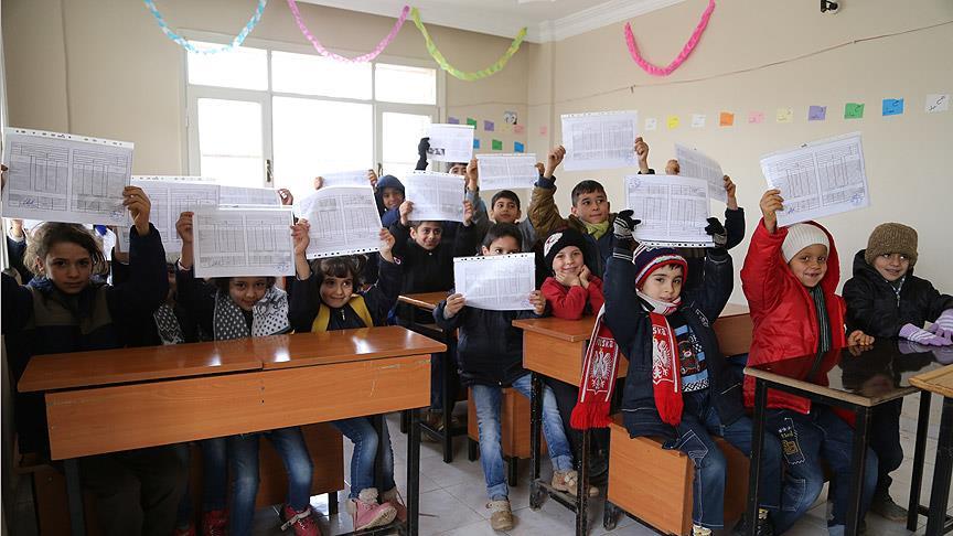 Suriye'deki iç savaştan aileleriyle kaçan ve Hatay'ın Reyhanlı ilçesindeki geçici eğitim merkezlerinde okullarına devam eden öğrenciler karnelerini aldı.