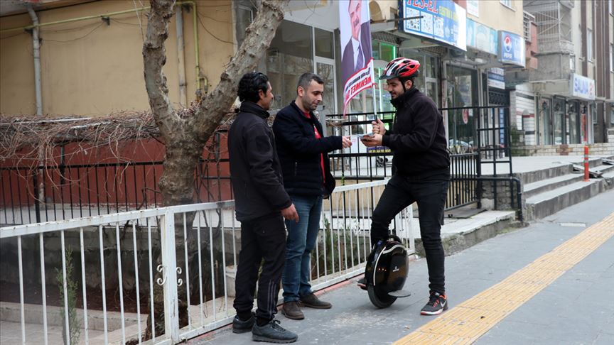 Diyarbakır'da Yenişehir Mahallesi Muhtar Adayı Mehmet Sağlam'a, oğlunun propaganda aracı olarak kullandığı "unicycle" (tek tekerlekli taşıt) ile destek vermesi dikkati çekiyor.