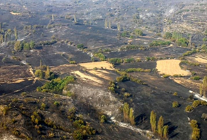 Helikopterdeki teknik ekibin çektiği fotoğraf ve görüntülerde, yangından önce yeşil bir örtüye sahip alanın siyaha büründüğü görülüyor.